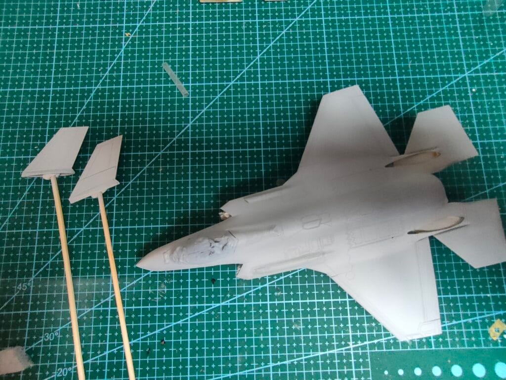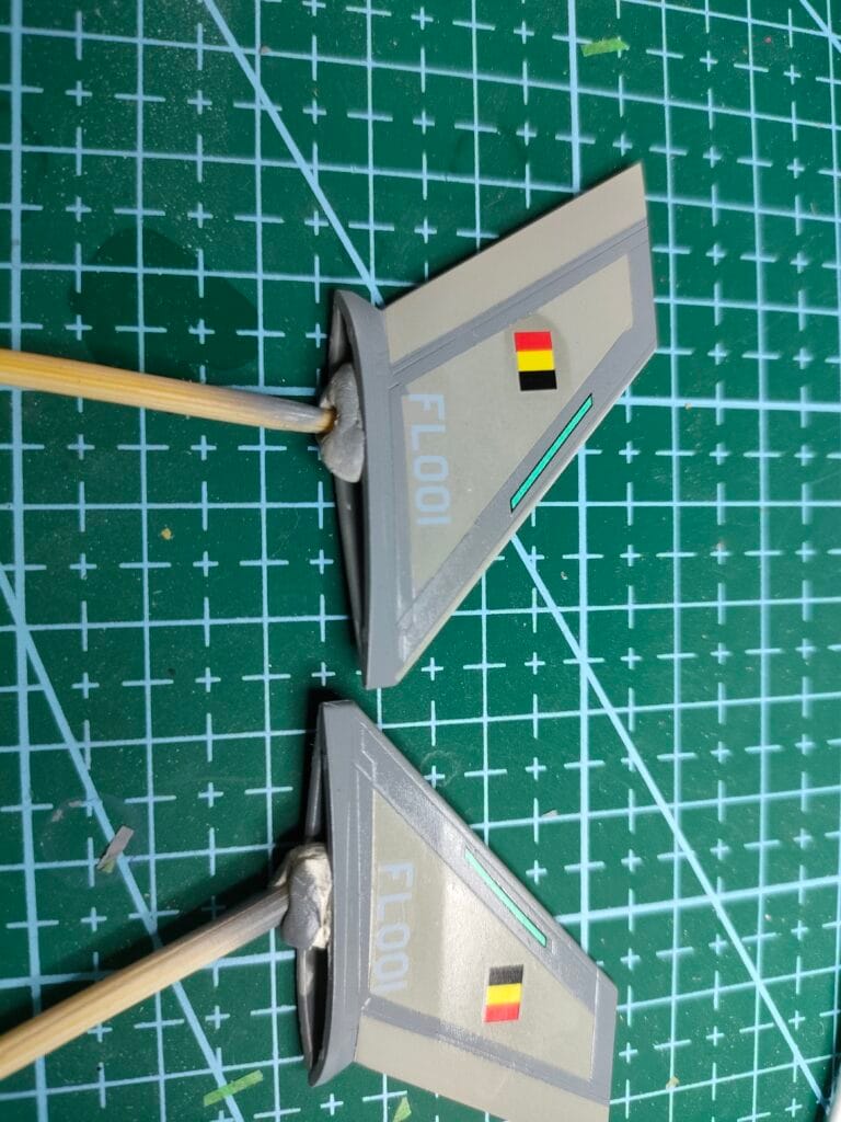 Avant de passer à la pose d’un jus, j’assemble les dérives et je colle les petites pièces comme les pitots, les feux de navigations, etc et j’applique de nouveau une couche de vernis brillant pour protéger les décalcomanies.