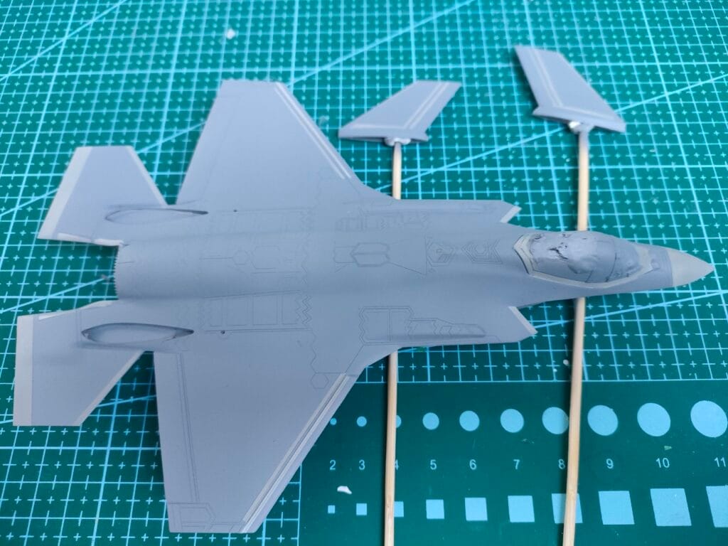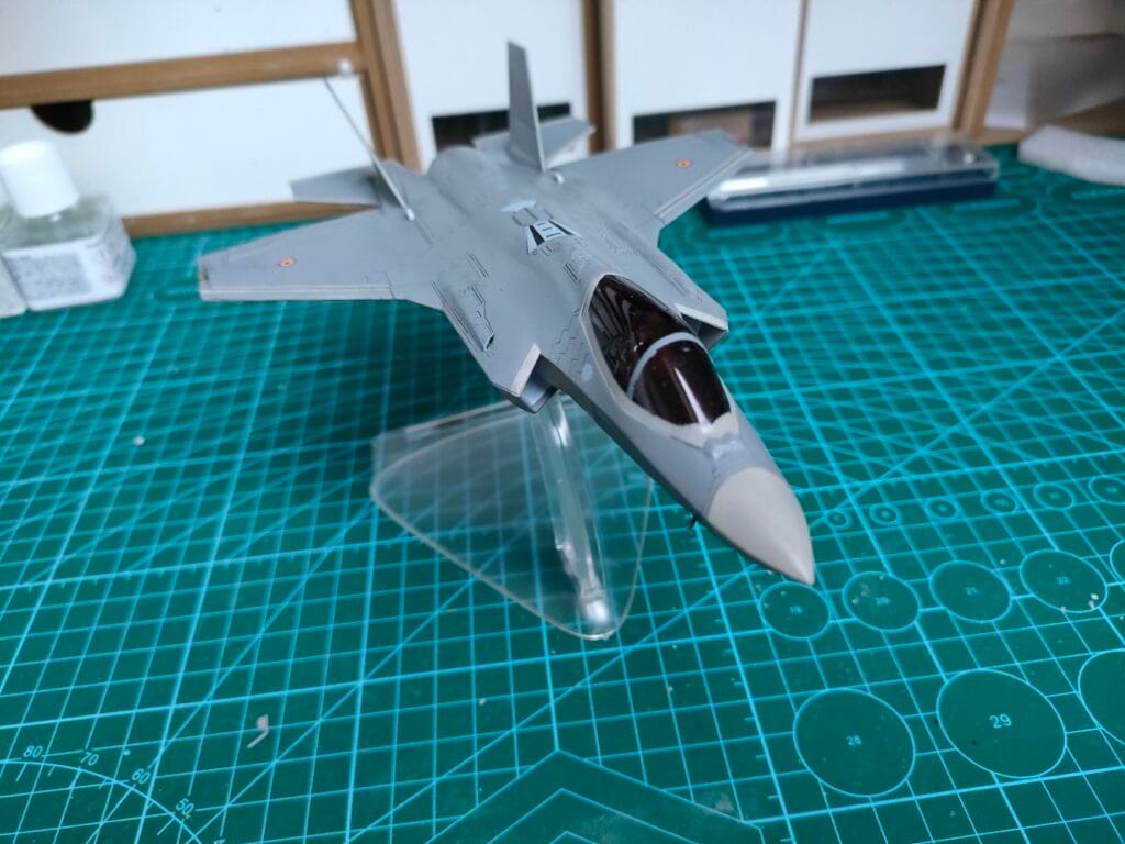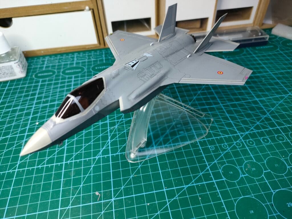 Nous en étions restés, le mois dernier, à la fin du montage de l’ensemble et nous étions prêts pour le commencement de la mise en peinture. C’est par cette étape que je vous propose de commencer dans cette deuxième et ultime partie de la réalisation du dernier chasseur en date de la Force Aérienne belge