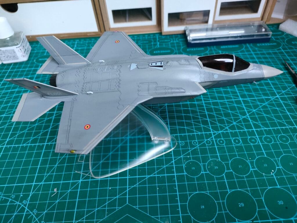 J’ai utilisé la planche de décalcomanies de ModelMaker spécialement éditée pour la version belge. J’ai cependant repris les décales du kit pour les bandes lumineuses sur les dérives et les entrées d’air car celles-ci ne sont pas fournies par ModelMaker.